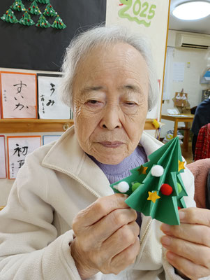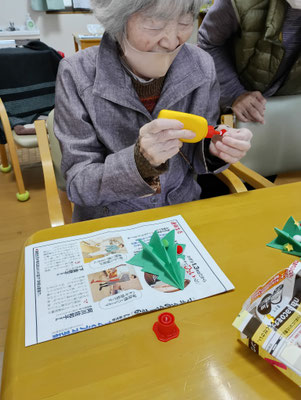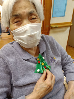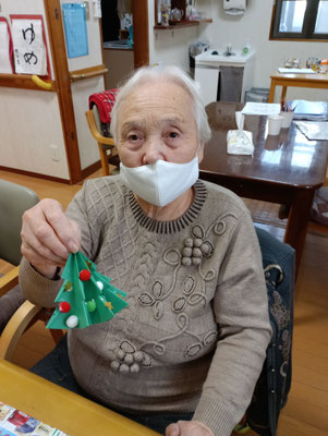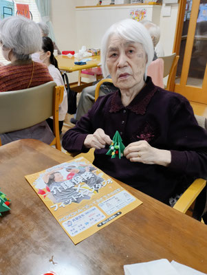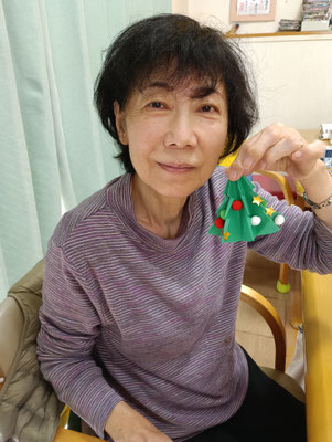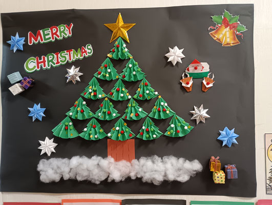 今回の壁飾りは、小さなクリスマスツリーを一人ずつ作ってもらい、全部くっ付けて大きなクリスマスツリーにする というものです。色画用紙を切って丸め、飾りをつけました。サンタやプレゼントなども付けて素敵なクリスマスツリーになりました。小さなツリーはそれぞれお持ち帰りいただく予定です。