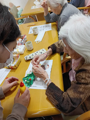 毎年クリスマスに合わせてお越しいただいて、素敵な演奏をしてくださるバイオリンの池田様とピアノの長尾様が今年も来てくださいました。皆さんと一緒に歌ったり、ハーモニカが得意な利用者さんとのセッションなど、楽しいひとときを過ごしました。中には感動のあまり涙する利用者さんもいらっしゃいました。途中スタッフによるハンドベルの演奏も行いました。(練習不足であまりうまくいきませんでした((+_+)))