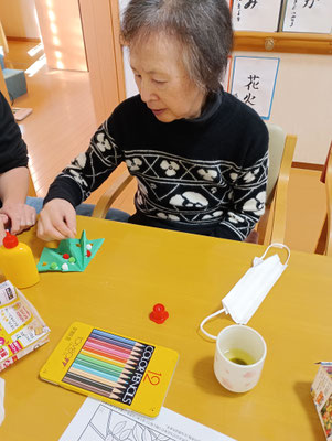 椿と節分の鬼のぬりえをし、一言添えていただきました。皆さん思い思いの椿や鬼ができあがりました。